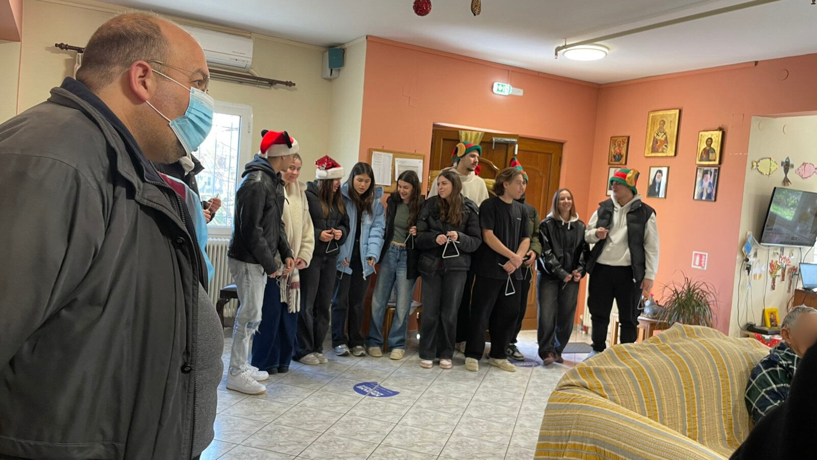 Μια ιδιαίτερα συγκινητική επίσκεψη δεχθήκαμε από τους μαθητές της Γ΄ Λυκείου του 1ου λυκείου Θήβας, οι οποίοι ήρθαν στο γηροκομείο μας συνοδευόμενοι από τον διευθυντή τους, κ. Χρήστου. Με χριστουγεννιάτικα σκουφάκια, χαμόγελα και ζεστή διάθεση, οι μαθητές μάς είπαν τα κάλαντα και γέμισαν τον χώρο με νεανική ενέργεια και γιορτινό κλίμα.